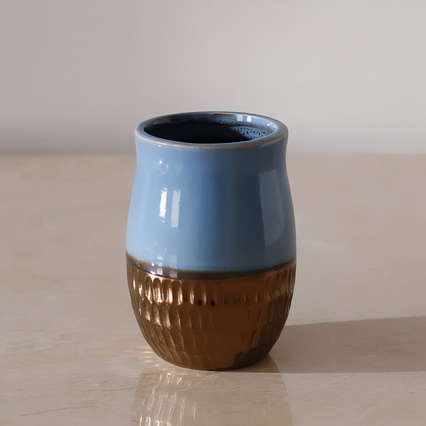 Chaque pièce des accessoires de salle de bain design en céramique bleu et marron est conçue avec soin. Le distributeur de savon est équipé d'une pompe en métal, assurant une utilisation pratique et durable. Les gobelets, dont l'un sert également de porte-brosse à dents, sont idéaux pour organiser vos essentiels tout en restant esthétiques. Leur design arrondi et leurs finitions brillantes les rendent faciles à nettoyer, tout en s’intégrant parfaitement dans un cadre chic et contemporain.