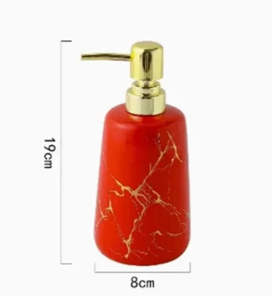 Le Kit Accessoires Salle de Bain Céramique Multi Couleur de Maison Essentia allie esthétique moderne et praticité. Composé d'un distributeur de savon, de gobelets, d'un porte-brosse à dents et d'un petit plateau, cet ensemble illumine votre salle de bain avec ses teintes rouges éclatantes et ses veines dorées uniques. Chaque pièce, avec sa forme cylindrique et légèrement ovale, est conçue pour apporter une touche contemporaine à votre espace.